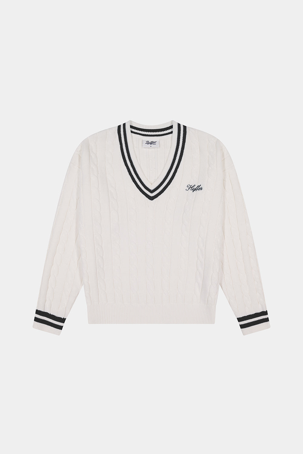 • Here's what you should know: 100% Cotton, Fully fashioned knit, Custom Huffer stripe, Cable knit pattern, Long sleeves, Huffer placement embroidery, Huffer branded gold metal plate